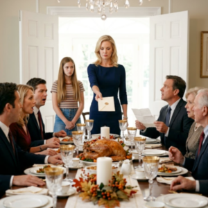 He stood at the head of his dining room with one hand resting on the carved back of a chair, smiling that polished, expensive smile he used in courtrooms and country clubs and every place where people measured each other by titles and confidence. His house was dressed for Thanksgiving in the way magazine spreads always seemed to be—cream candles down the center of the table, gold-rimmed glasses, folded linen napkins tucked through brass rings, a turkey resting under the warm gleam of recessed lighting like it had been staged for an advertisement rather than dinner.
